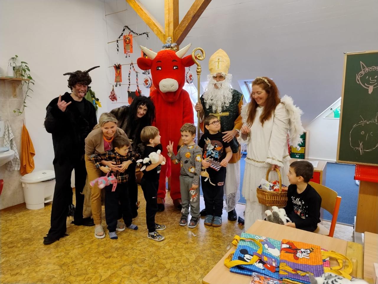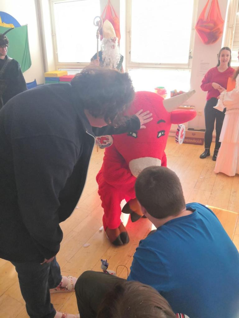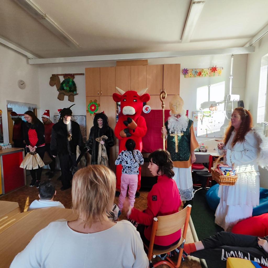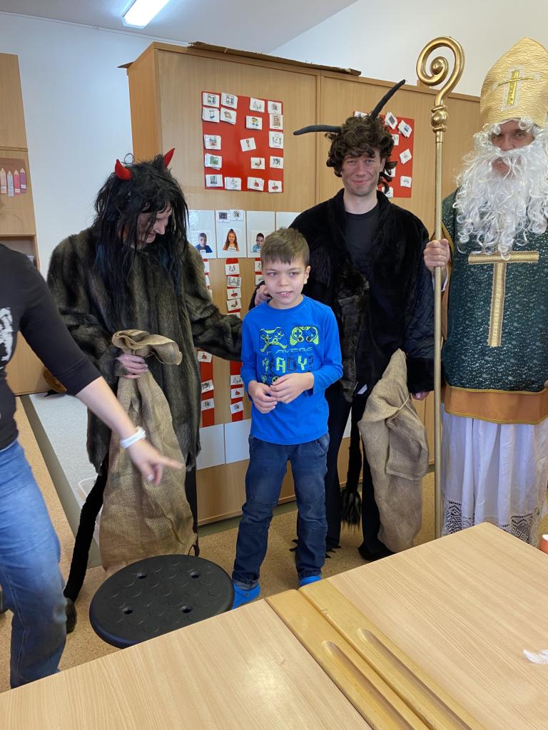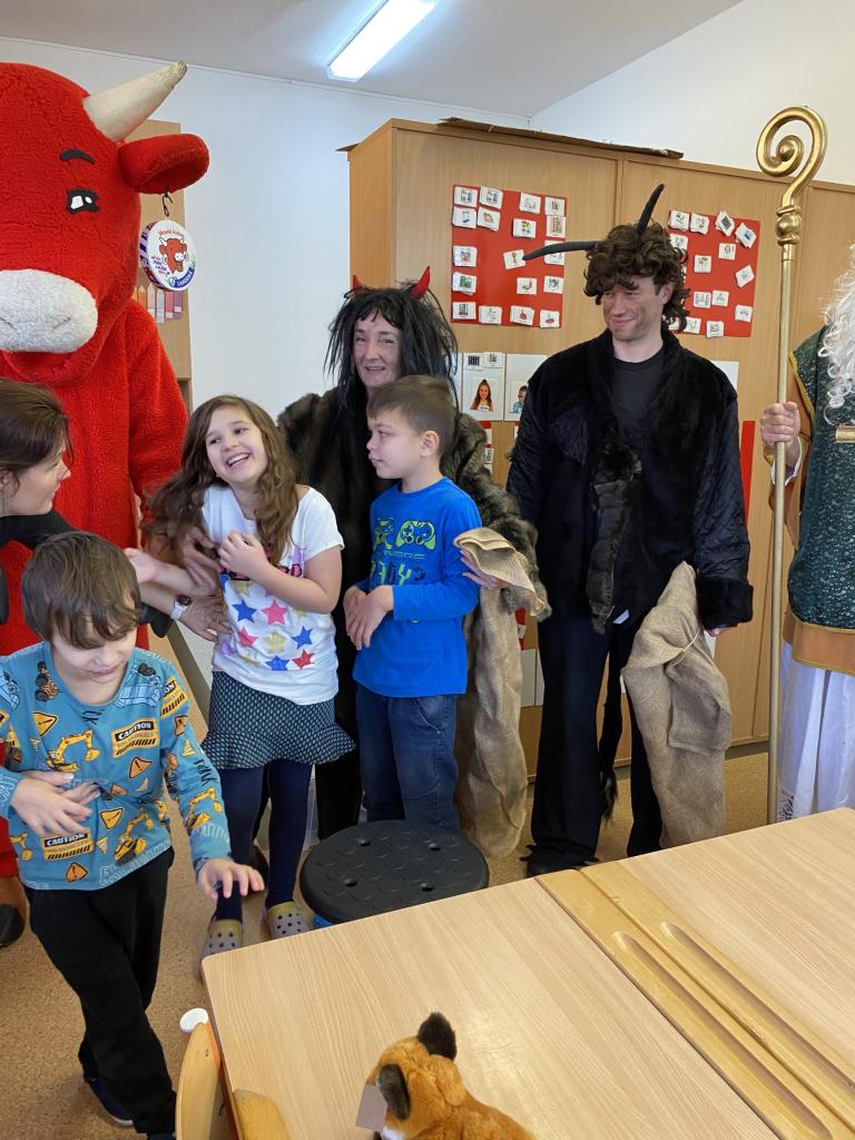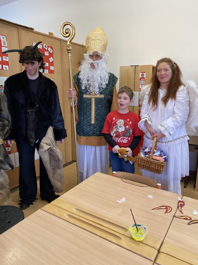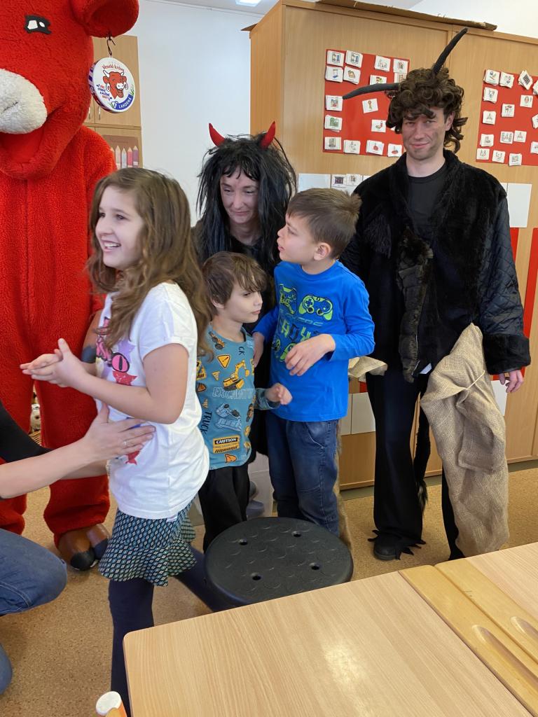 Ve škole nás navštívili tradiční postavy Mikuláš, čert a anděl a i netradiční Veselá kráva - sponzor mikulášského dne byla firma Bel sýry Česko. Za podporu děkujeme i OS Přístav.