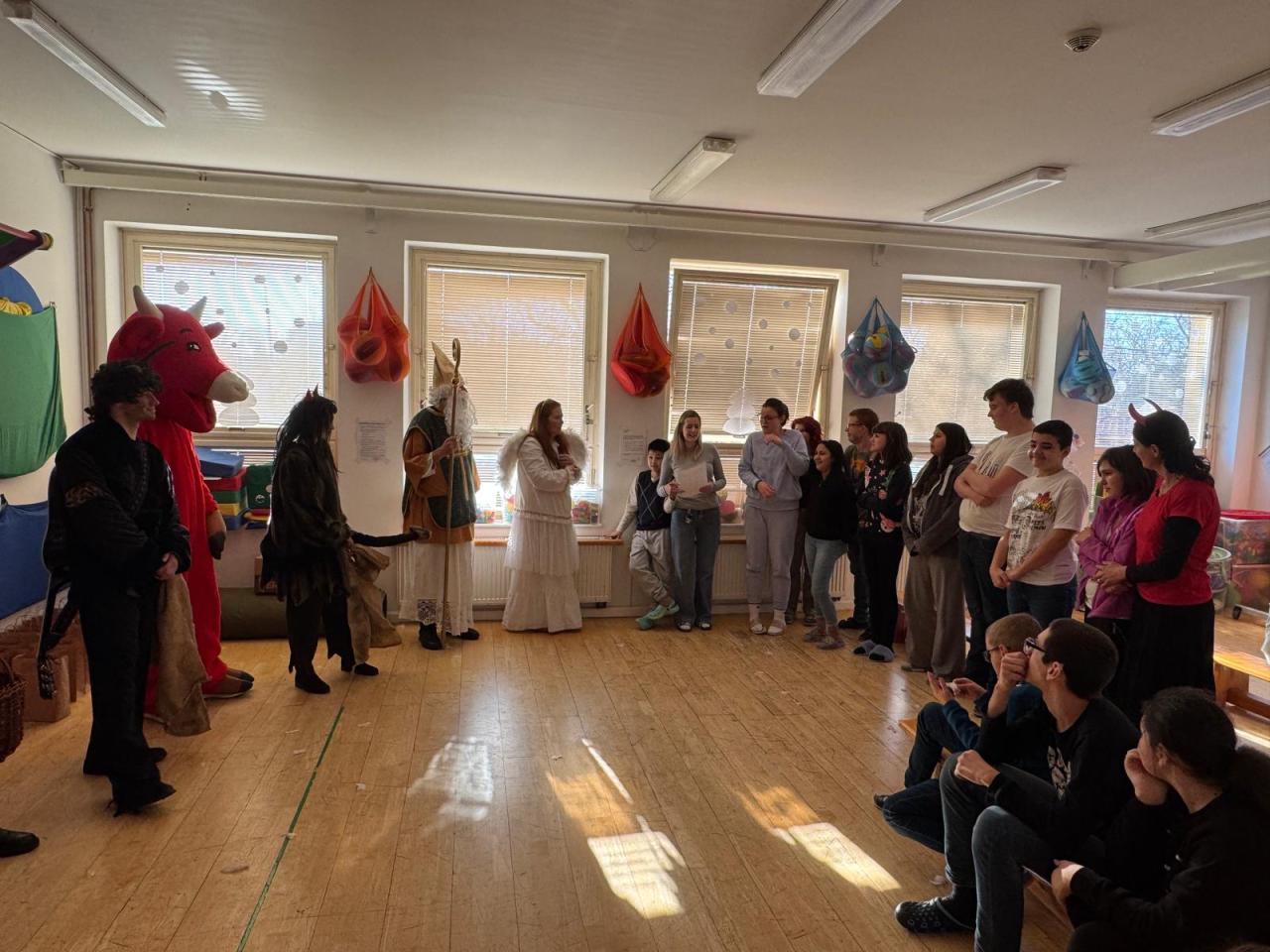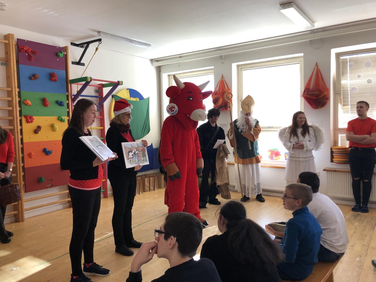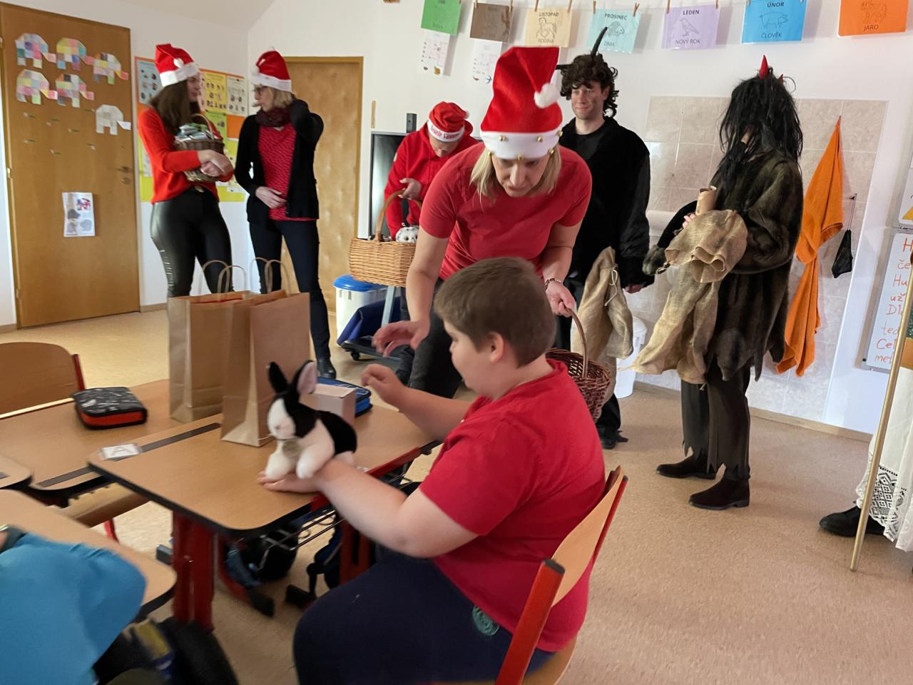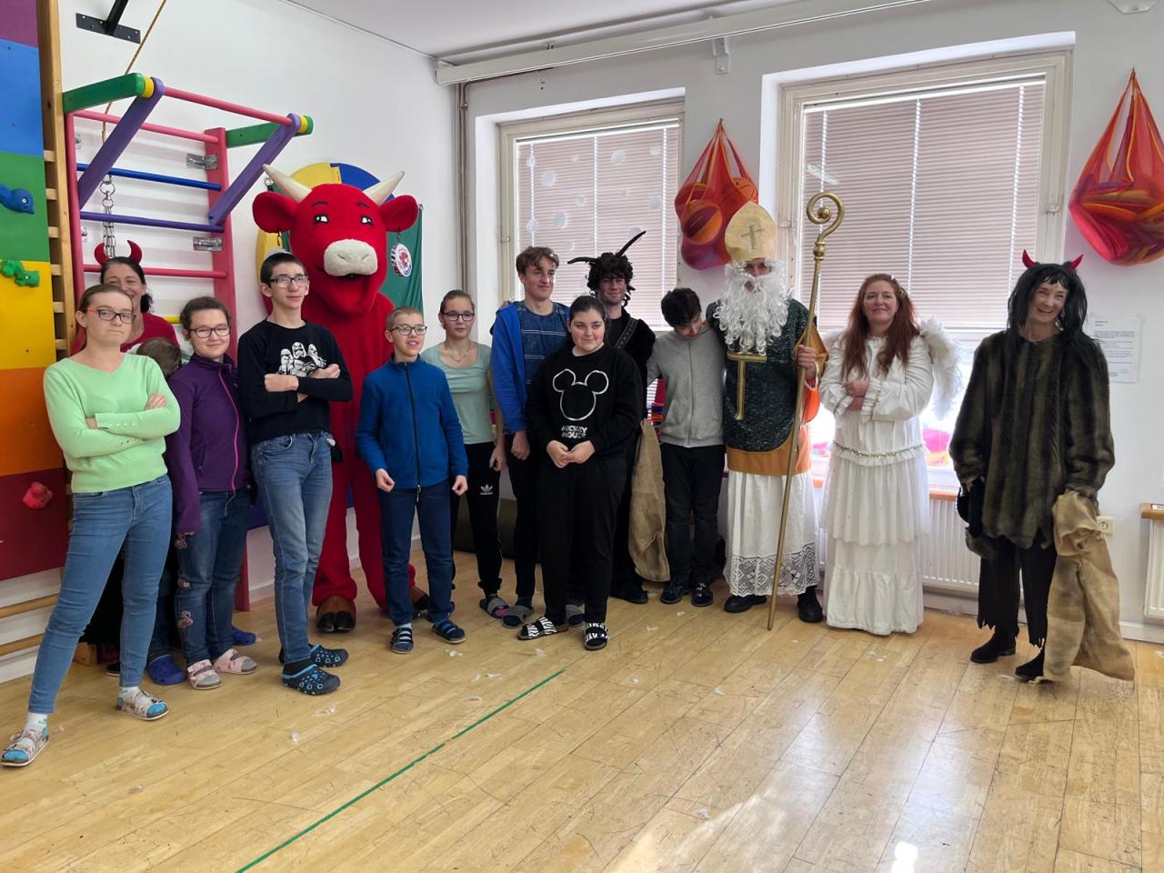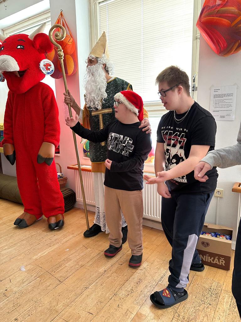 Ve škole nás navštívili tradiční postavy Mikuláš, čert a anděl a i netradiční Veselá kráva - sponzor mikulášského dne byla firma Bel sýry Česko. Za podporu děkujeme i OS Přístav.