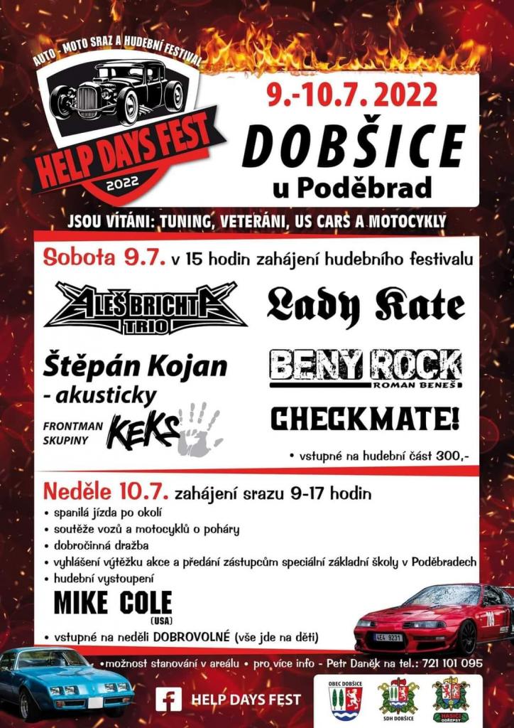 Rádi bychom vás pozvali na benefiční festival a sraz automobilů Help Days v Dobšicích. Kapely vystoupí v sobotu 9.7., v neděli 10.7. se sjedou rozličná tuningová, historická a vojenská vozidla a motocykly a v odpoledních hodinách bude naší škole, stejně jako v roce loňském, slavnostně předán výtěžek akce.