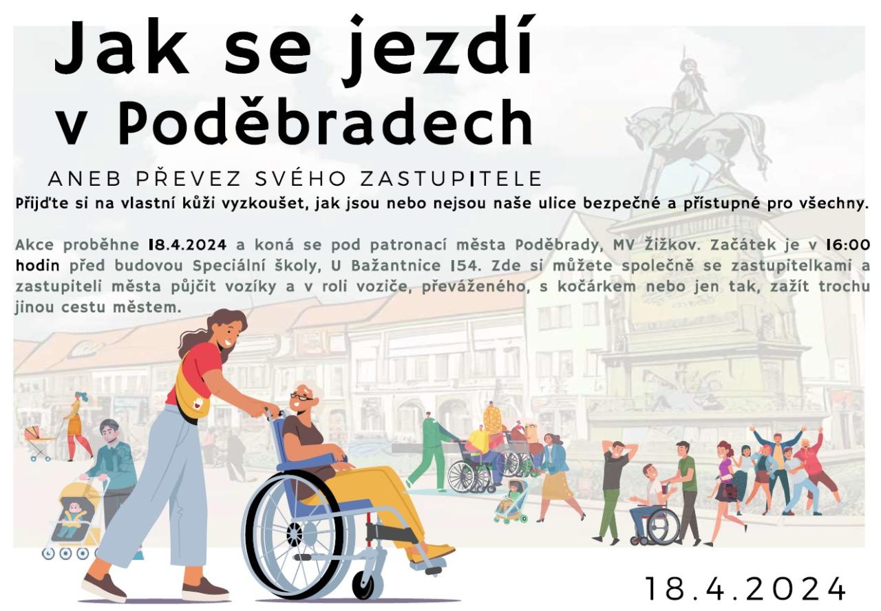 Akce proběhne 18.4.2024 a koná se pod patronací města Poděbrady, MV Žižkov. Začátek je v 16:00 hodin před budovou Speciální školy, U Bažantnice 154. Zde si můžete společně se zastupitelkami a zastupiteli města půjčit vozíky a v roli voziče, převáženého, s kočárkem nebo jen tak, zažít trochu jinou cestu městem.