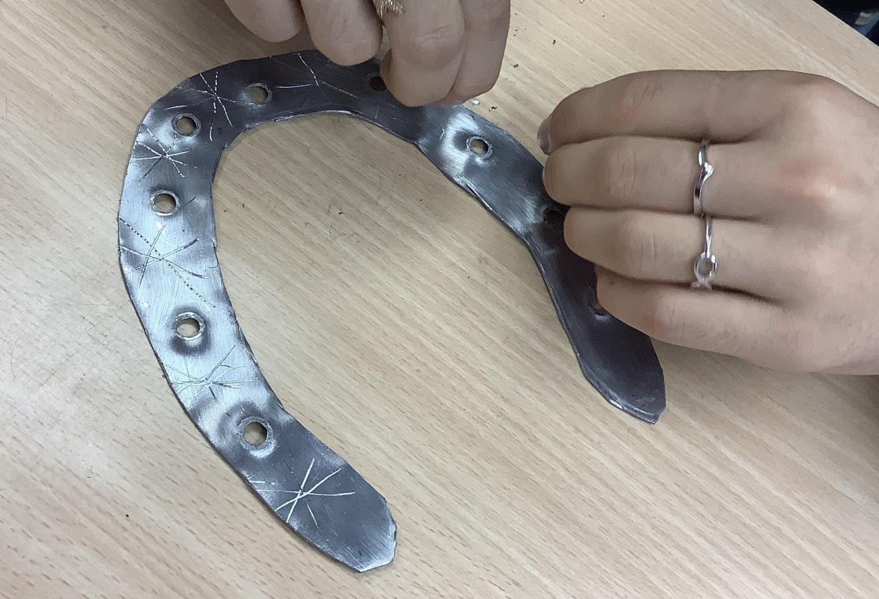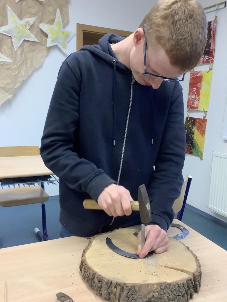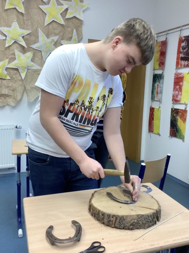 Martin na svém koni zavítal i do Pracovních činností. Chlapci z 5.B a 6.B vyráběli jeden ze známých symbolů - podkovy. Žáci si vyzkoušeli jednoduchou práci s měkkým kovem, ze kterého vyřezávali tvar podkovy. Jemným smirkem je vyleštili, pomocí kladiva a raznice vyrazili díry, drátem pak vyryli sněhové vločky a na závěr dozdobili stužkou. Práce šla chlapcům od ruky, byli velmi šikovní a dílo se jim povedlo na jedničku.