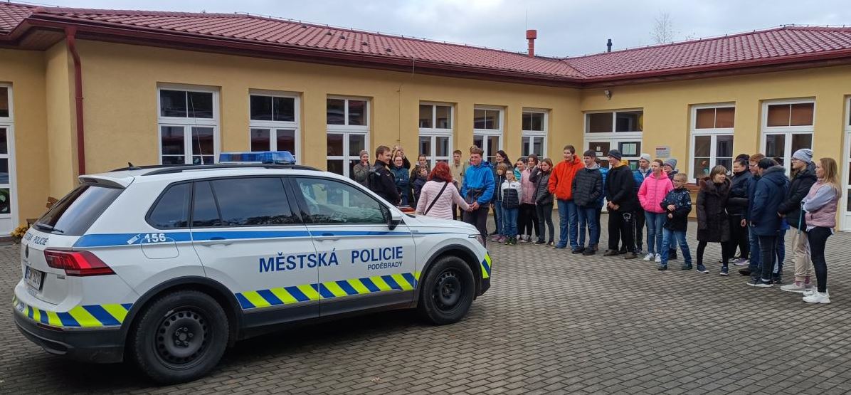 Na půdě školy, za zvuku policejní sirény, nás policisté seznámili s tím, co je náplní práce Městské policie a jakým disponuje vybavením.